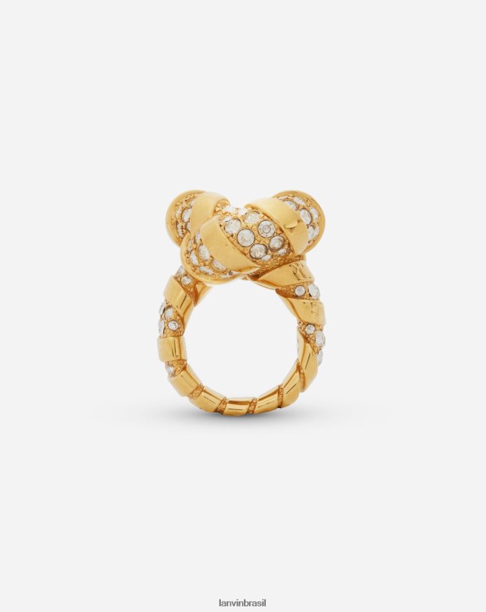 a linha melodie presta homenagem a todos os vestidos de jeanne lanvin chamados ”melodie” criados entre 1921 e 1939. o anel melodie que incorpora elegância, é decorado com um laço de strass e ao redor do qual está enrolada uma fita de metal dourado .