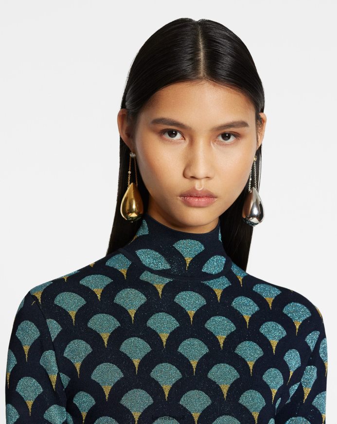 a linha de joias arpege homenageia a icônica tampa do perfume lanvin. nesta temporada a linha apresenta grandes gotas suaves como gotas de água ou esferas coroadas com strass.