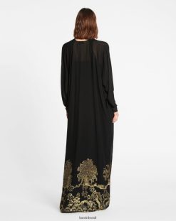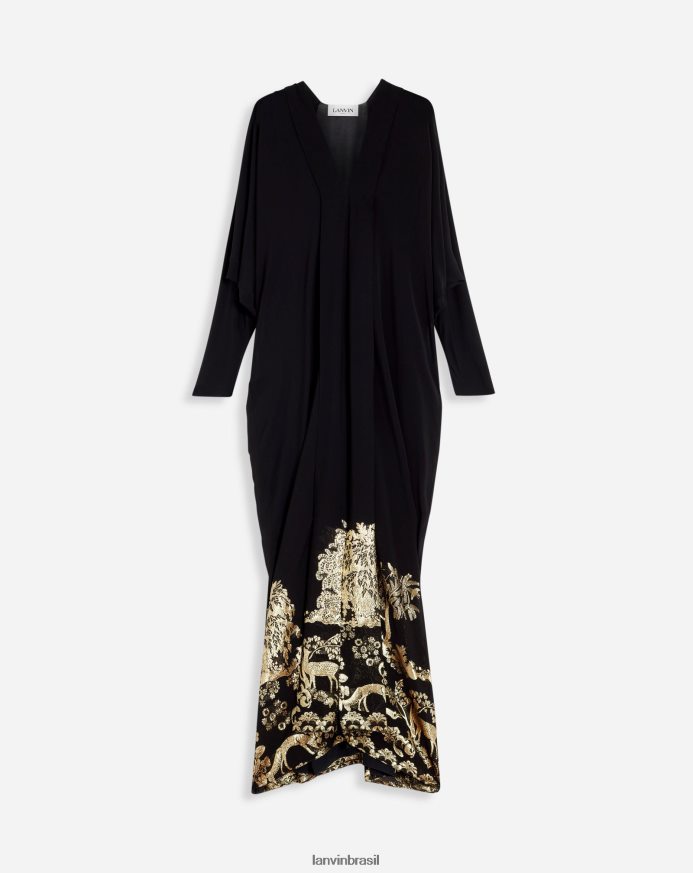 - o vestido é decorado com padrão jacquard dourado inspirado no trabalho do artista armand-albert rateau