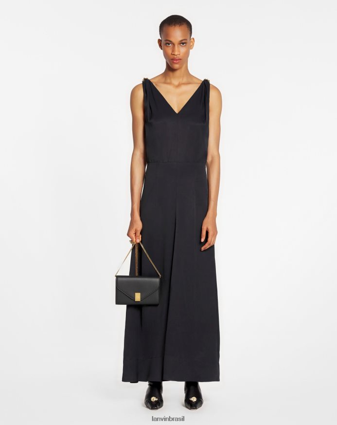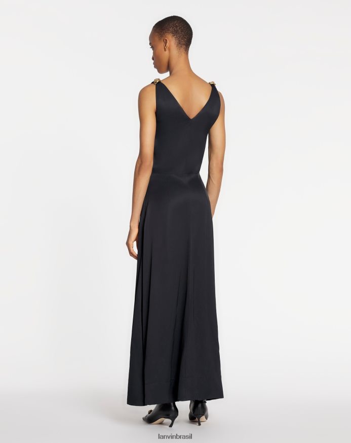 - ajuste e vestido midi flare com alças largas formando um decote em V profundo.