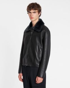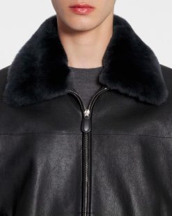 - jaqueta em pele de bezerro granulada, com gola shearling removível e costela inferior atrás.