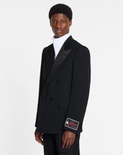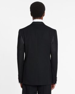- jaqueta smoking trespassado preta em lã com ombros quadrados , cintura justa e inserções de cetim tom sobre tom dentro das mangas.