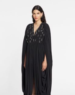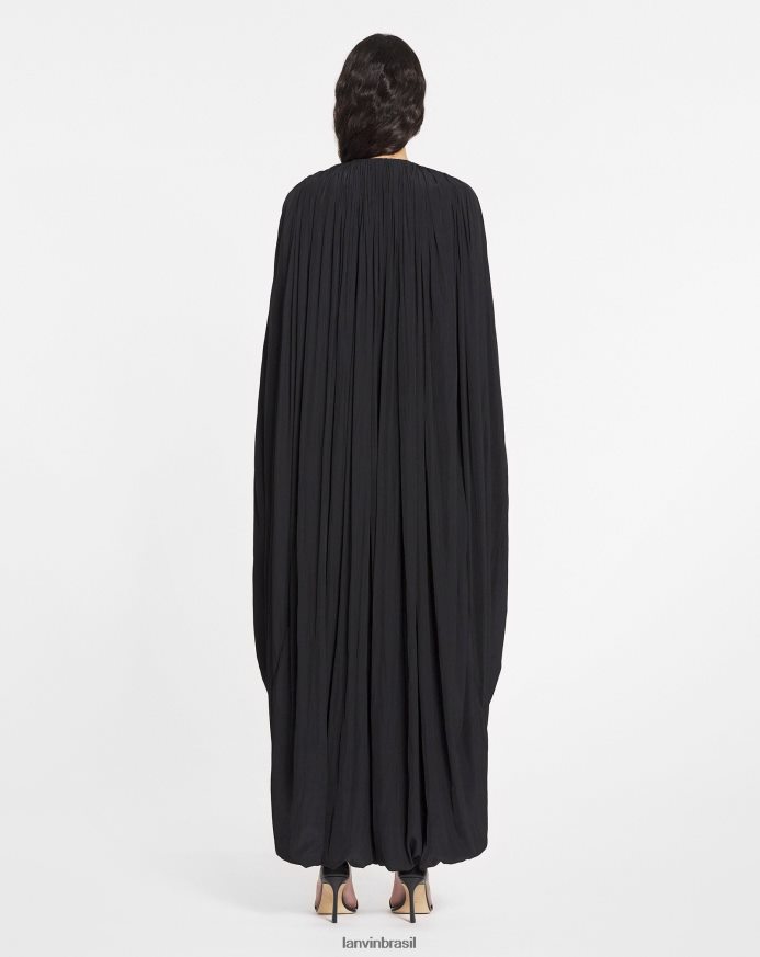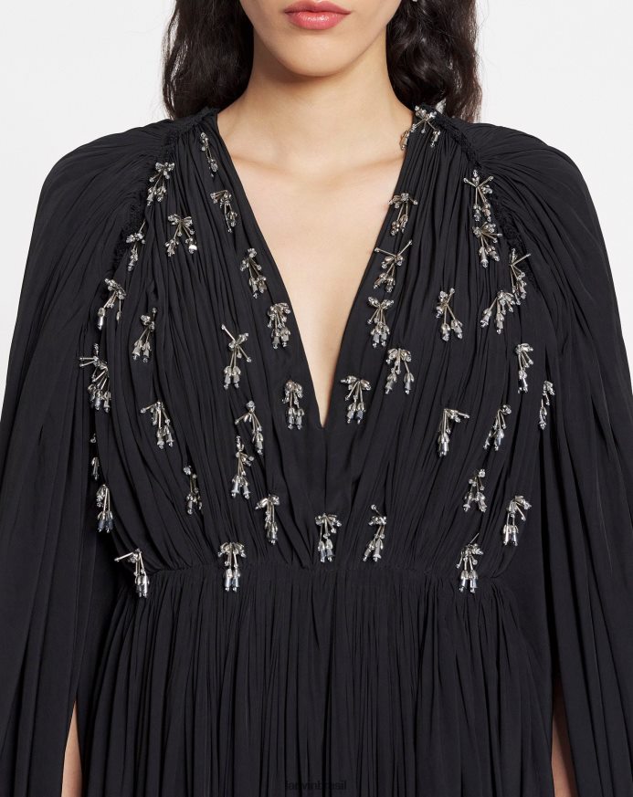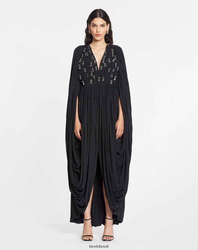 - vestido longo drapeado em charmeuse, tecido exclusivo da Lanvin, embelezado com bordados na frente