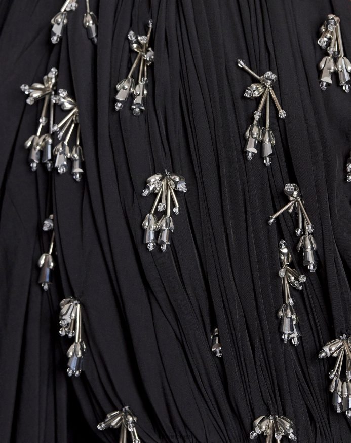 o exclusivo bordado artesanal representa a ilusão de gotas de água do mar congeladas nas roupas. são confeccionados com pérolas de vidro transparente com acabamento em revestimento metalizado e contas de metal combinadas para acentuar o efeito.